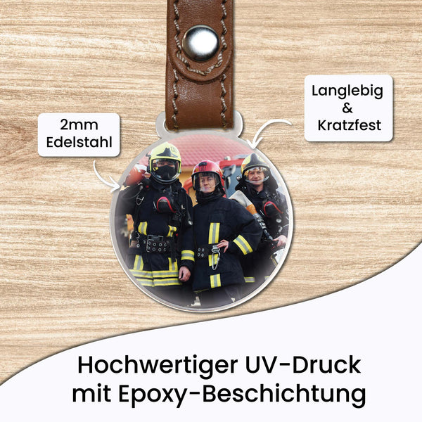 Ein Zeichen des Mutes – Dein persönlicher Feuerwehr-Anhänger Auf der Vorderseite dieses hochwertigen Anhängers trägst Du ein persönliches Foto – ob im Einsatz, mit dem Team oder ein Moment voller Stolz in Uniform. Auf der Rückseite wird das klassische Feuerwehr-Signet eingraviert – stark, detailreich und bedeutungsvoll – ergänzt durch Deinen individuellen Wunschtext. So entsteht ein kraftvolles Symbol für Mut, Zusammenhalt und persönliche Geschichte.
