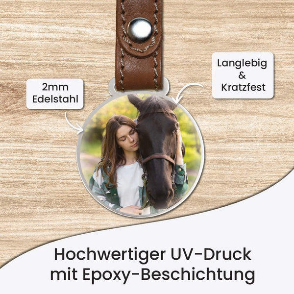 Für Dein Seelenpferd – ein Stück Erinnerung für jeden Tag Manche Pferde hinterlassen Spuren, die für immer bleiben. Auf der Vorderseite dieses hochwertigen Schlüsselanhängers kannst Du ein Herzensfoto Deines Seelenpferdes verewigen – ein Moment im Sonnenlicht, beim Training oder einfach beim gemeinsamen Sein. Die Rückseite trägt die schlichte, aber bedeutungsvolle Gravur: „Seelenpferd“ – ein Wort, das alles sagt.